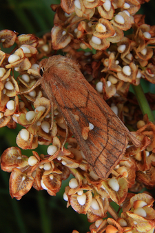 Rechts zwei Schmuckstücke , die in der Kiesgrube einen geeigneten Lebensraum finden: Eine Weißfleck-Graseule (Mythimna conigera) und das Weibchen einer Vierfleck-Kreuzspinne (Araneus quadratus).